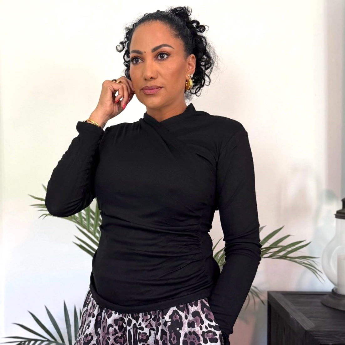This draped top is that effortless statement piece that instantly elevates your entire look. The soft stretch fabric hugs in all the right places, while the asymmetrical wrap detail adds a sleek, fashion-forward edge. It’s the perfect balance of polished and cool—easy to dress up with heels or keep casual with denim. Whether layered or worn on its own, this is the kind of top that makes every outfit feel intentional. A true wardrobe essential you'll reach for on repeat.