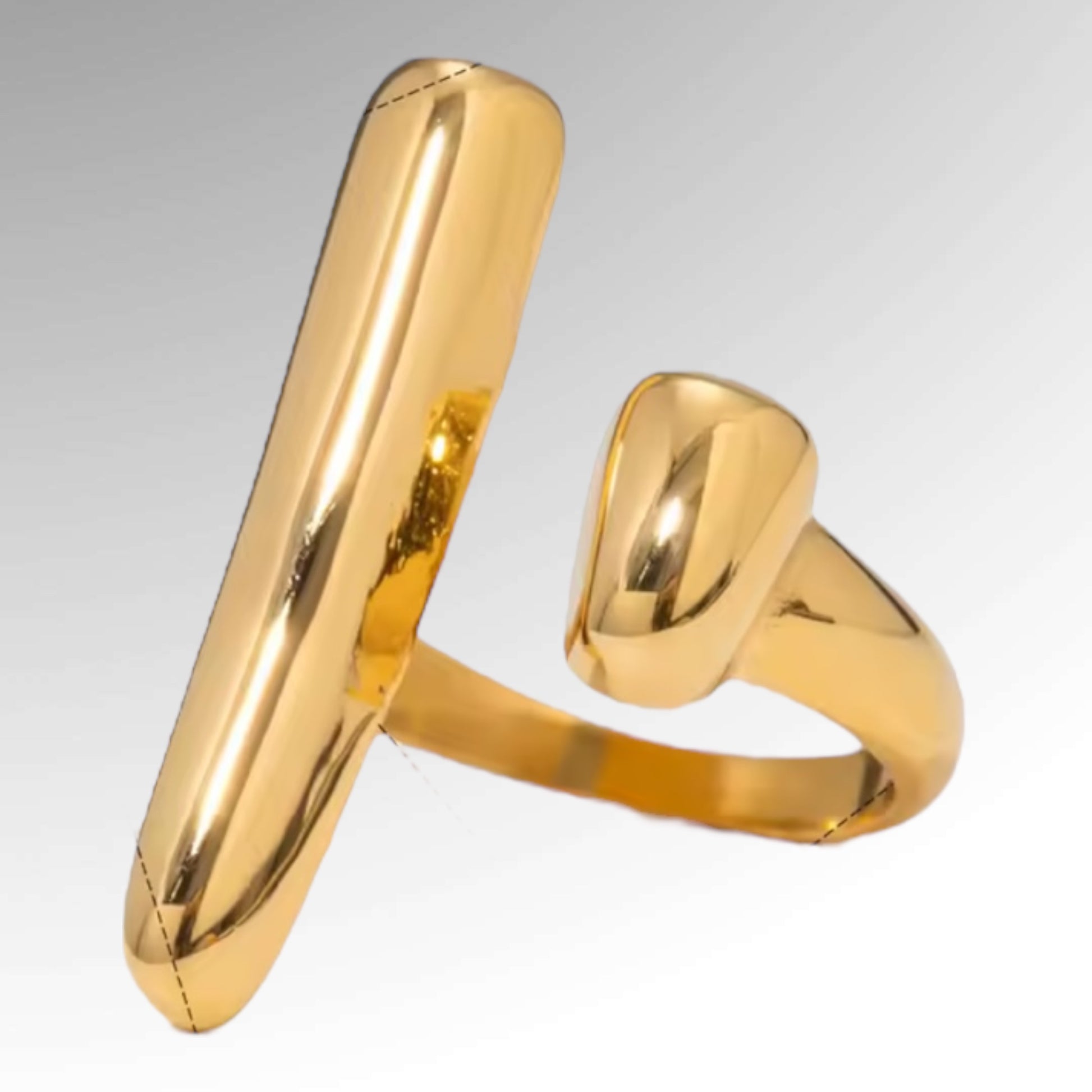 Dare to be different with our Abstract Bar Wrap Ring, the ultimate statement in modern elegance. Featuring a bold vertical bar and asymmetrical open design, this gold-tone piece adds instant edge to any outfit. Its sleek, high-shine finish catches the light—and the compliments. Perfect for solo wear or stacking, it’s the conversation starter your jewelry box needs. Add it to your cart and elevate your look with one bold move.