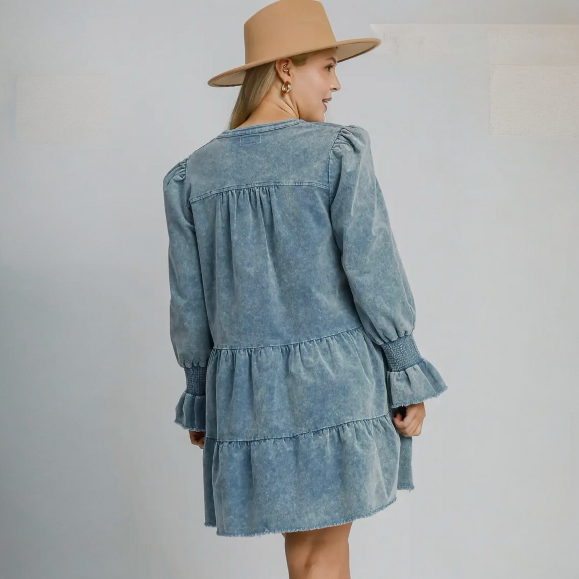 Bring effortless charm to your wardrobe with this washed denim babydoll dress. Featuring a flattering V-neckline, puffed long sleeves with smocked cuffs, and a tiered silhouette, it strikes the perfect balance between relaxed and chic. The soft, lived-in wash adds a touch of vintage character, while the flowy fit keeps you comfortable all day. Pair it with ankle boots and a hat for an easy, stylish look that works from brunch to weekend adventures.
