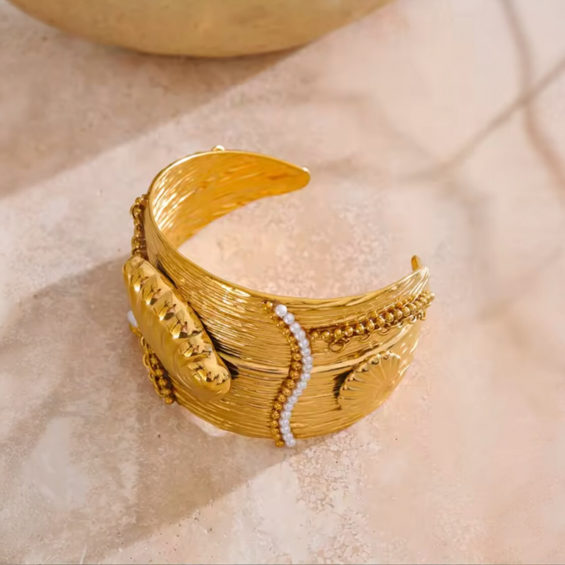 Channel oceanic elegance with the Oceana Tide Cuff, a breathtaking piece inspired by the sea’s natural beauty. Sculpted in textured gold and adorned with delicate pearl-like accents and shell motifs, this cuff blends coastal charm with luxe sophistication. Its bold silhouette makes a powerful statement, yet it’s lightweight enough for effortless wear from day to night. Add this stunning cuff to your collection and bring a touch of seaside glamour to any outfit.