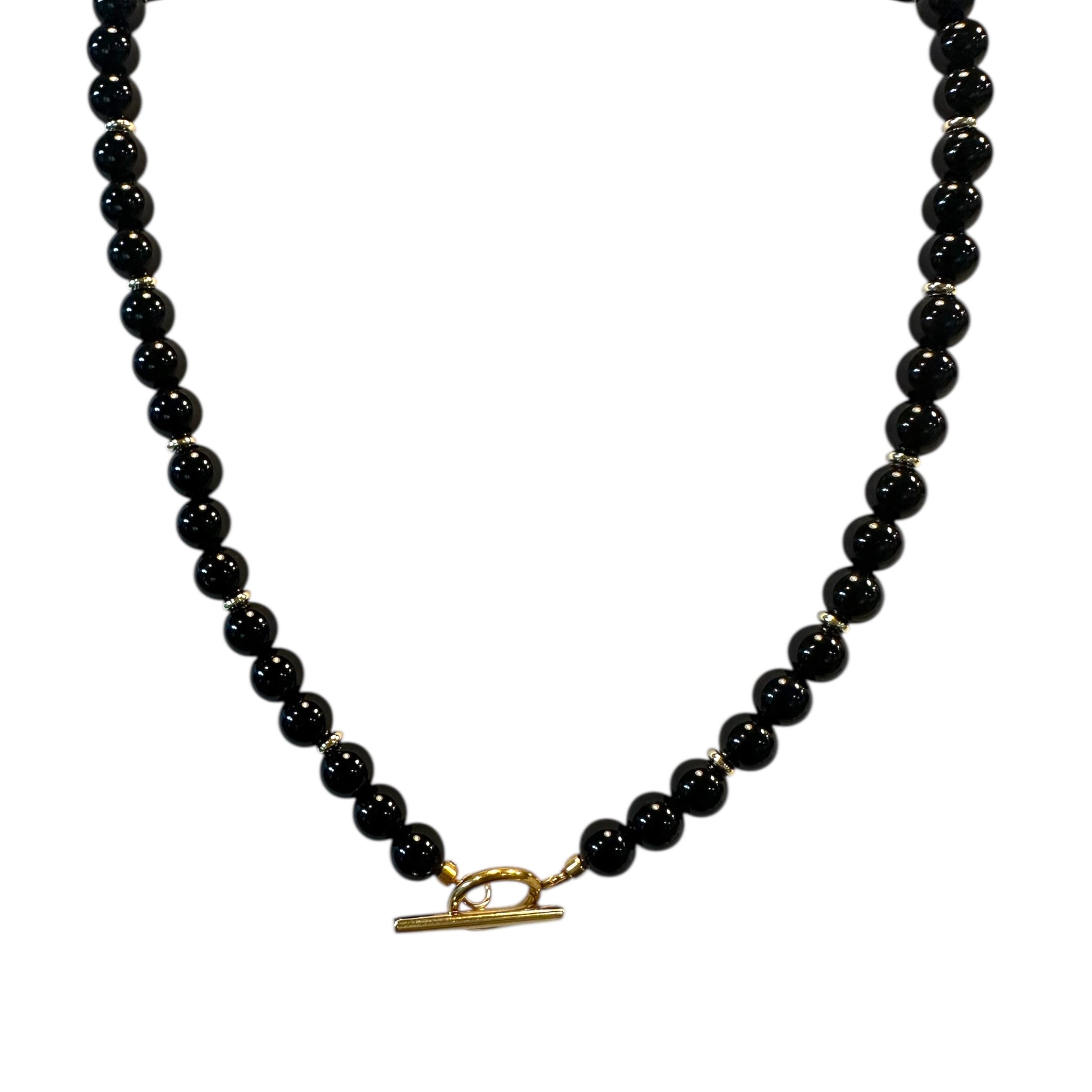 This necklace features polished black onyx beads with a sleek gold toggle clasp — a timeless piece that’s as protective as it is elegant. Black Onyx is believed to shield against negative energy, promote inner strength, and help you stay grounded in challenging times. Perfect for adding both sophistication and a sense of calm confidence to any look.