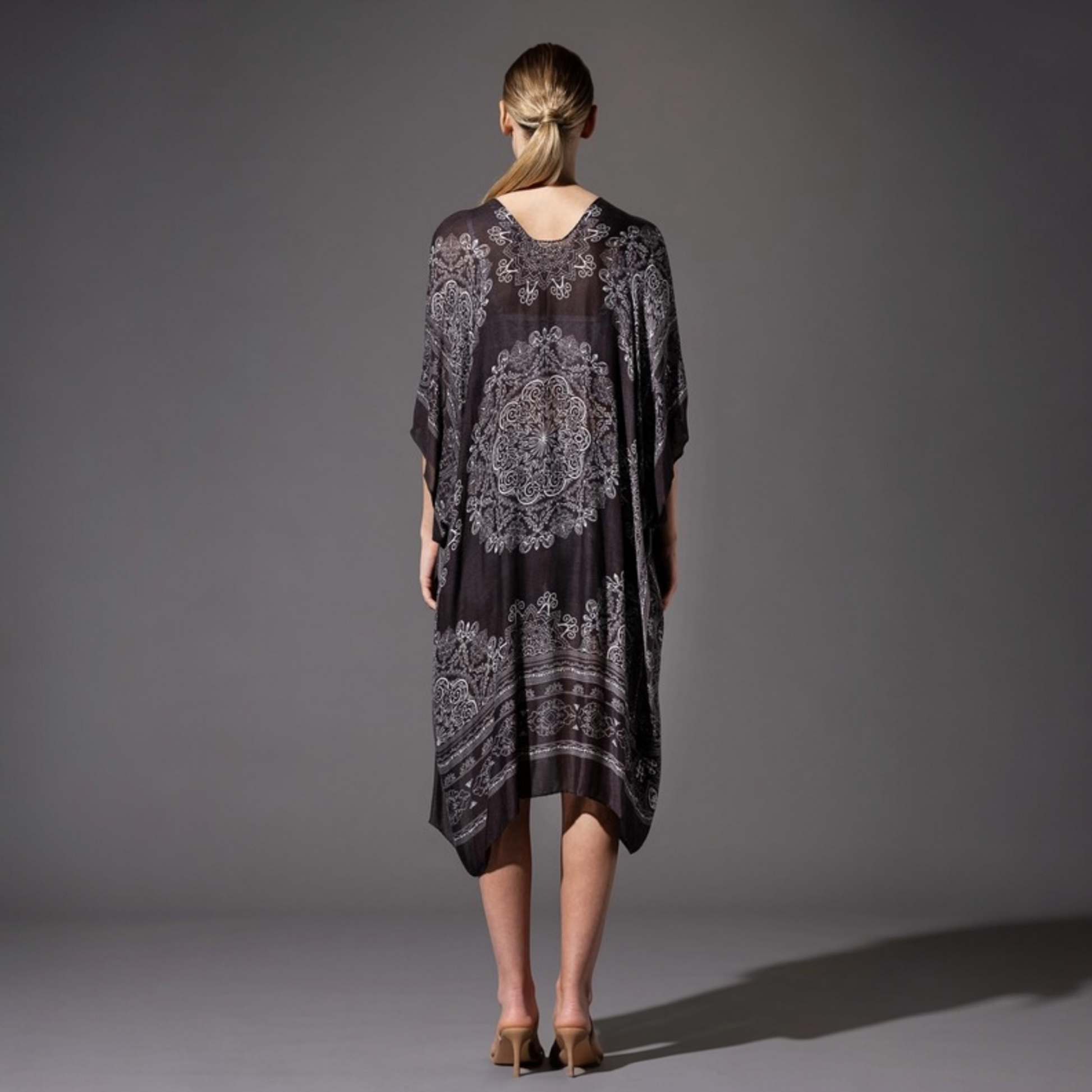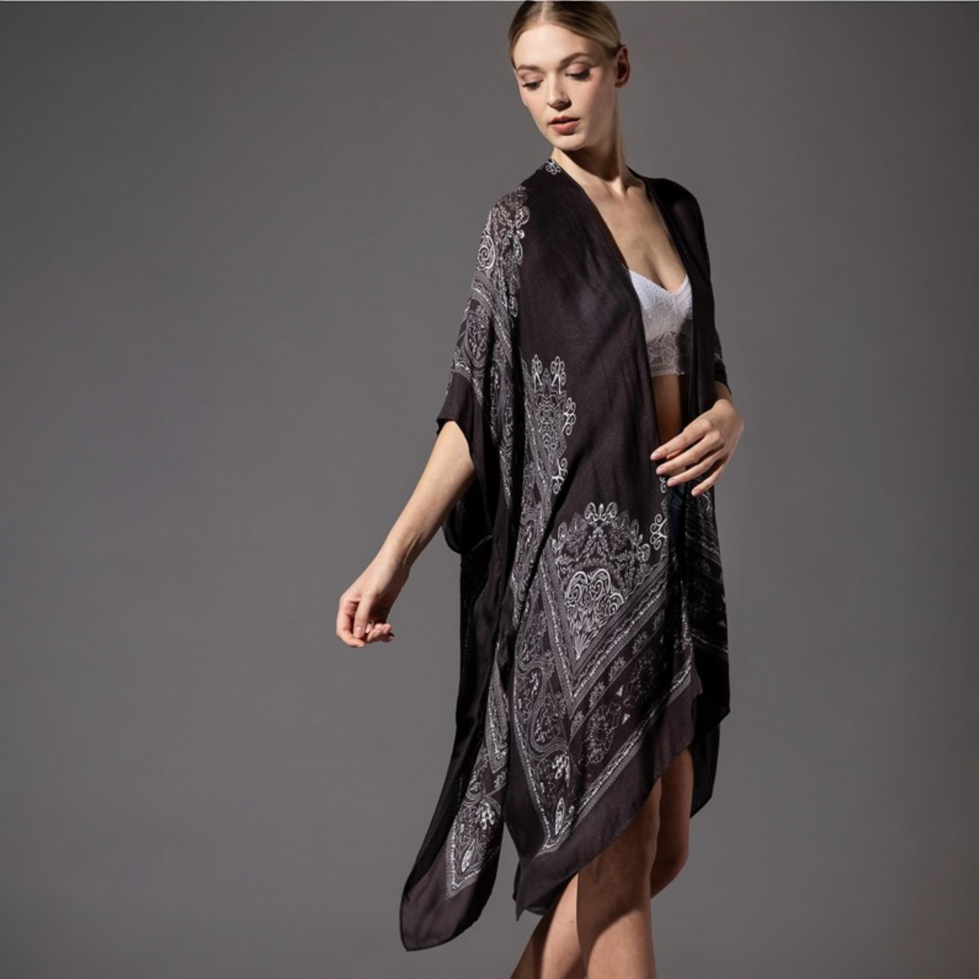 Wrap yourself in effortless elegance with this lightweight, boho-inspired kimono. Featuring an intricate mandala print and a flowy, open-front silhouette, it’s the perfect layer to elevate any outfit—whether you're lounging or heading out. Pair it with jeans and heels for a casual chic vibe, or throw it over a swimsuit for resort-ready style. Available in both black and rust tones, this kimono is your new wardrobe essential. Don’t miss out—
