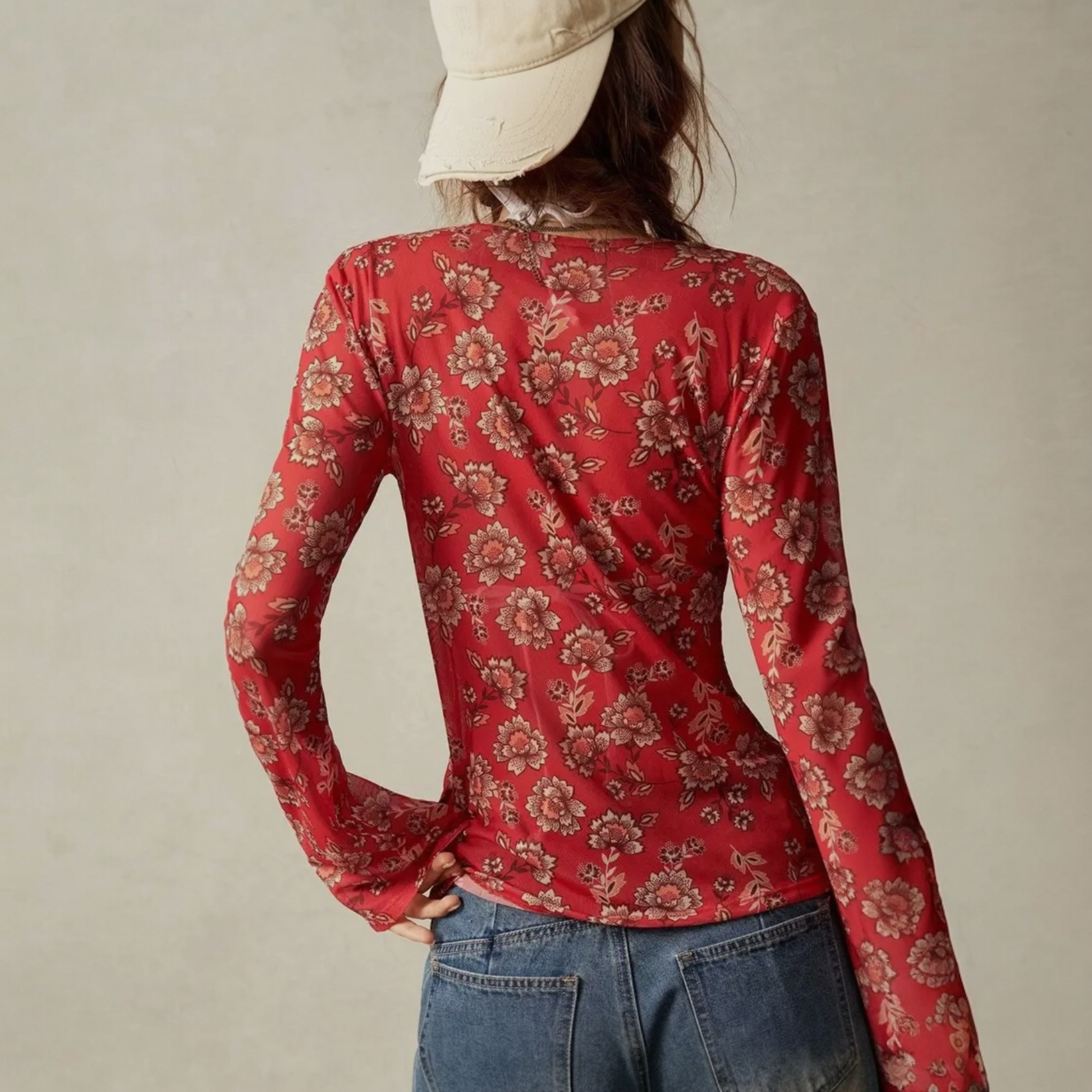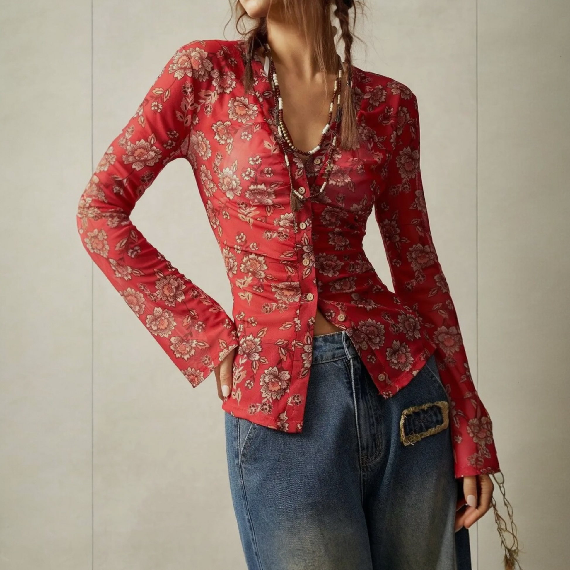 Turn heads in this vibrant red floral blouse that effortlessly blends femininity with a modern edge. Designed with a flattering ruched front and button-down detail, it hugs your curves in all the right places while offering a chic, vintage-inspired look. The semi-sheer mesh fabric makes it perfect for layering over a bralette or tank, giving you endless styling options. Pair it with jeans for a laid-back vibe or dress it up with a skirt for a night out—either way, this blouse is a must-have statement piece for your wardrobe.