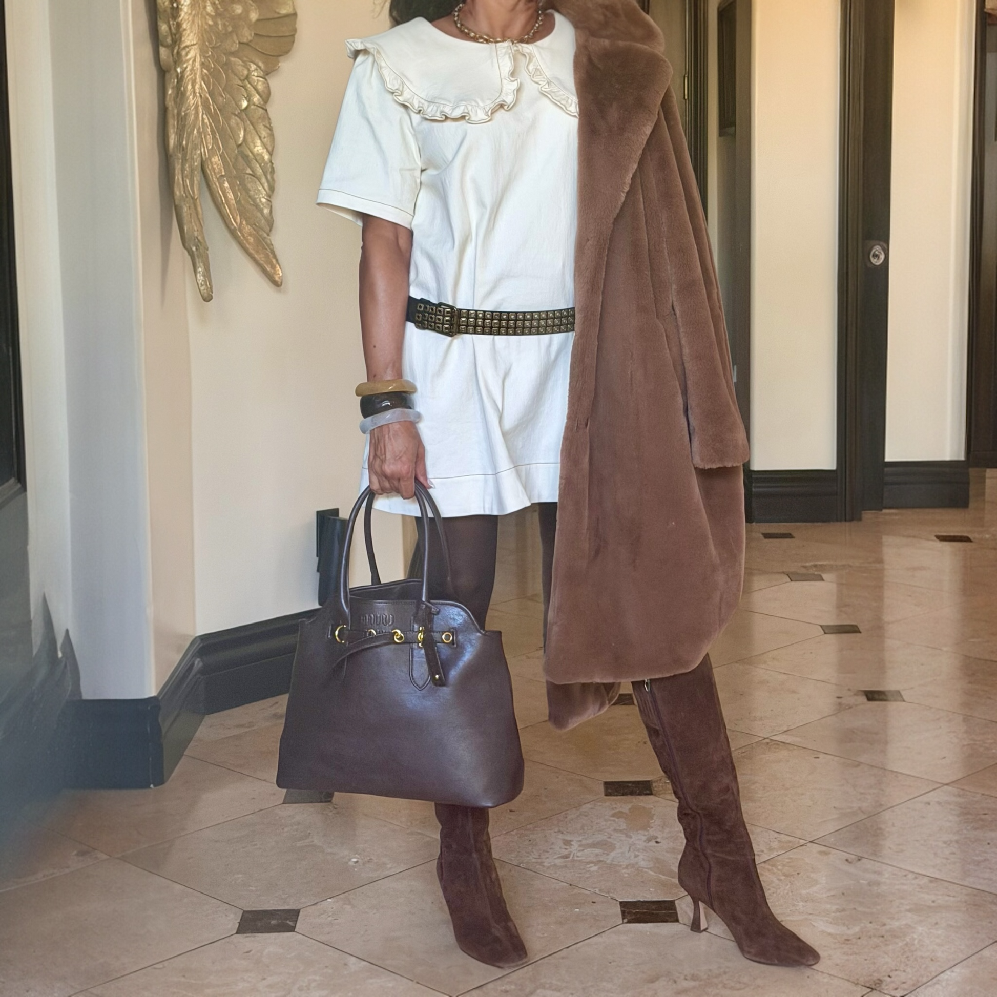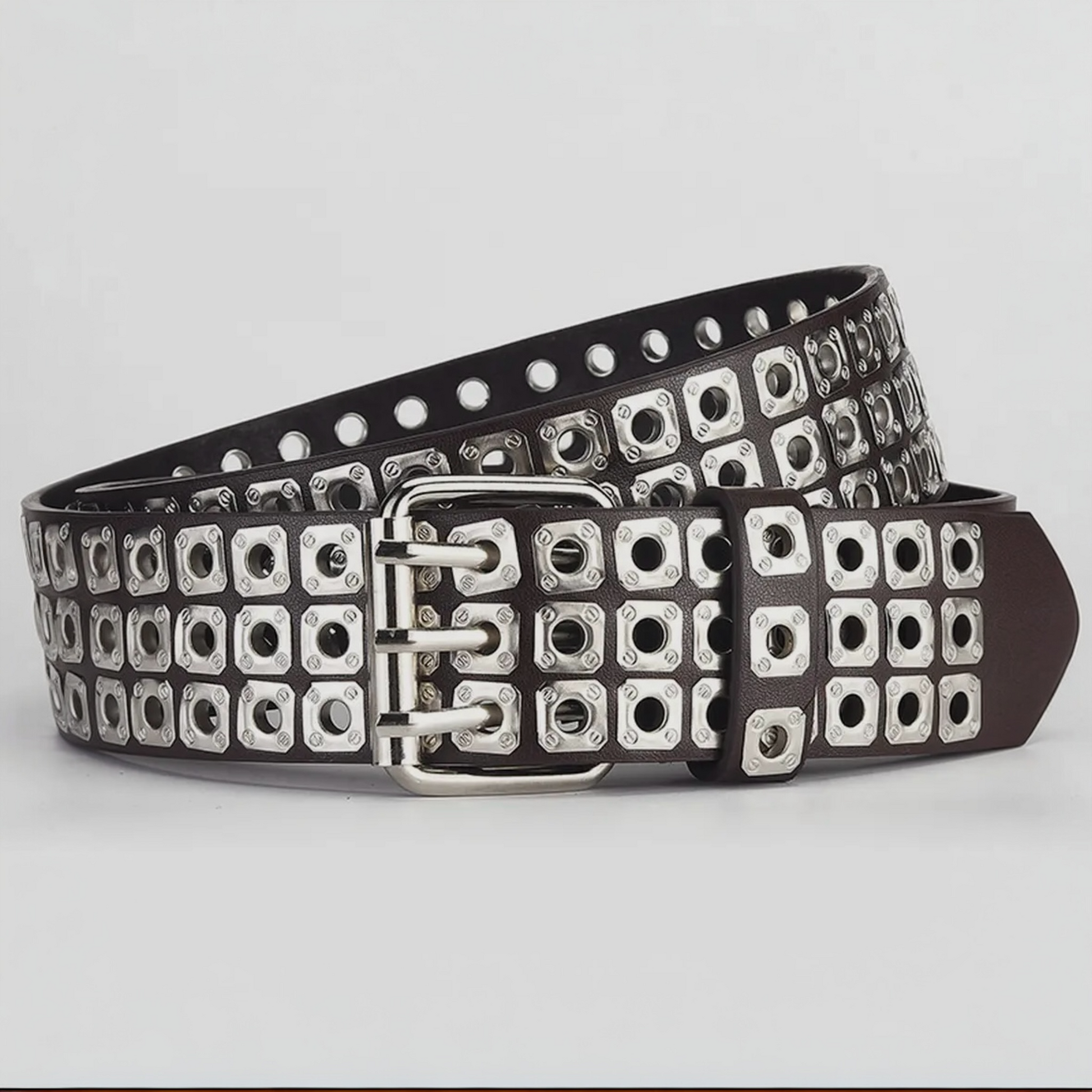 Turn every outfit into a statement with this bold studded belt — a perfect blend of edgy sophistication and timeless style. Crafted from vegan leather and detailed with square metal grommets, it adds instant attitude to dresses, denim, or jumpsuits. The triple-prong buckle enhances its vintage rock-inspired appeal while ensuring a secure, flattering fit. Whether you choose the brass or silver finish, this belt is the ultimate accessory to elevate your look with confidence and flair.